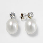 Arete oro blanco 14k con perla blanca 12.8 mm y brillante